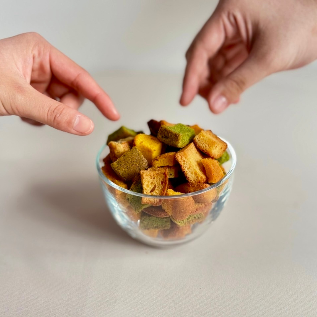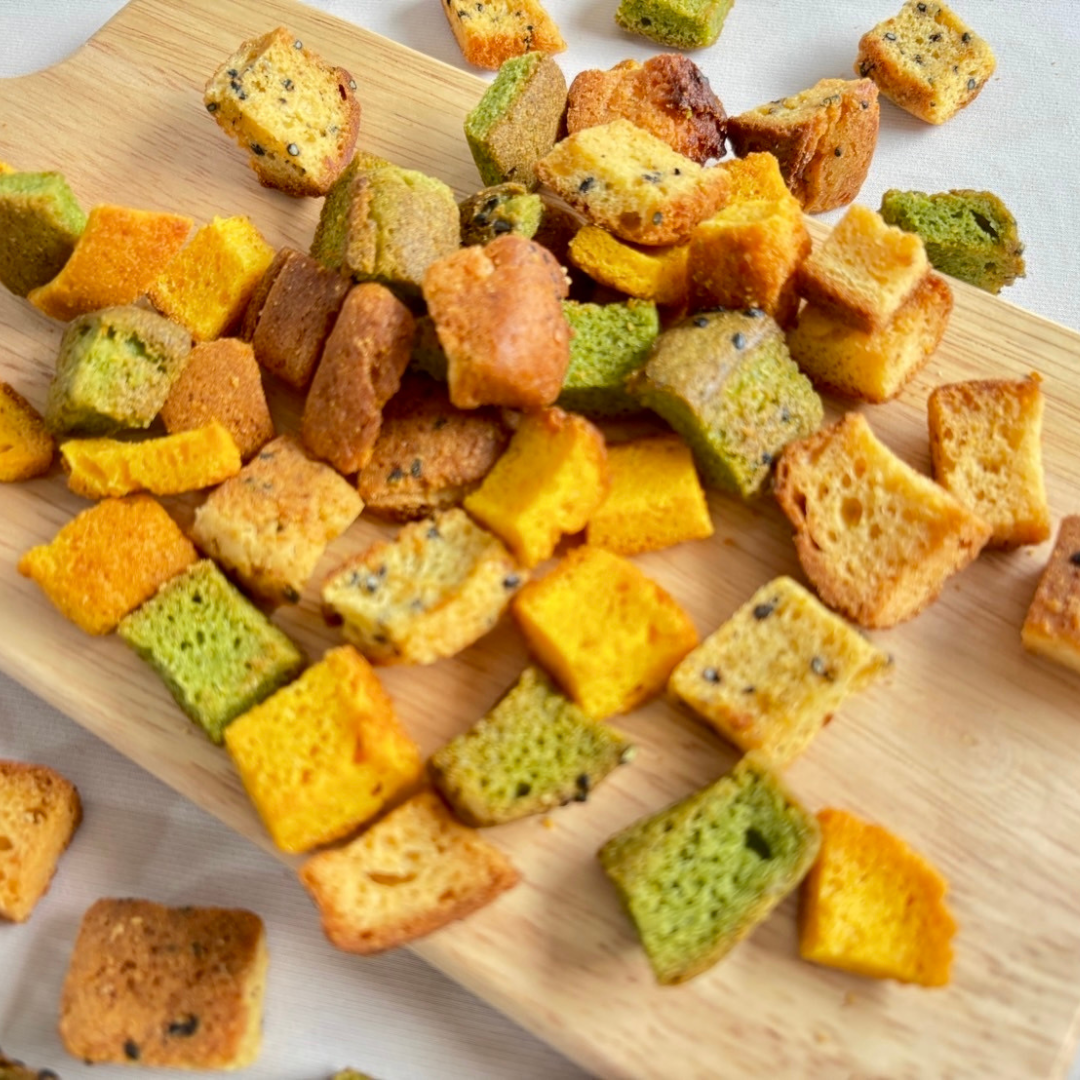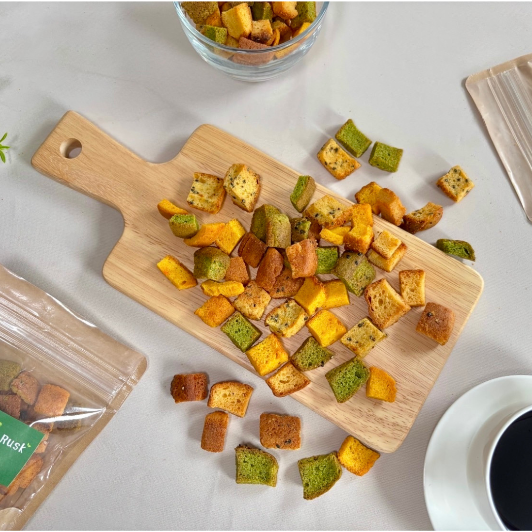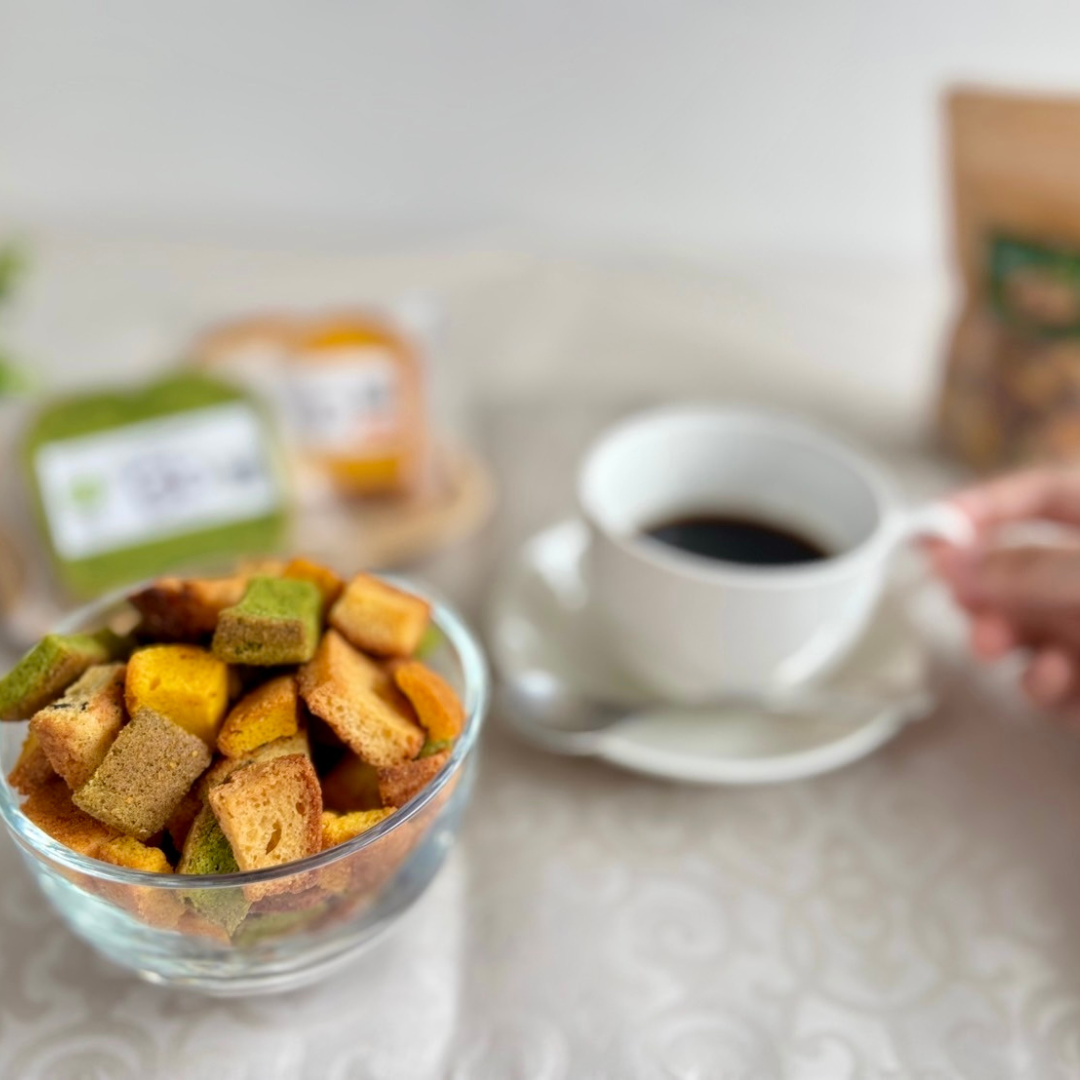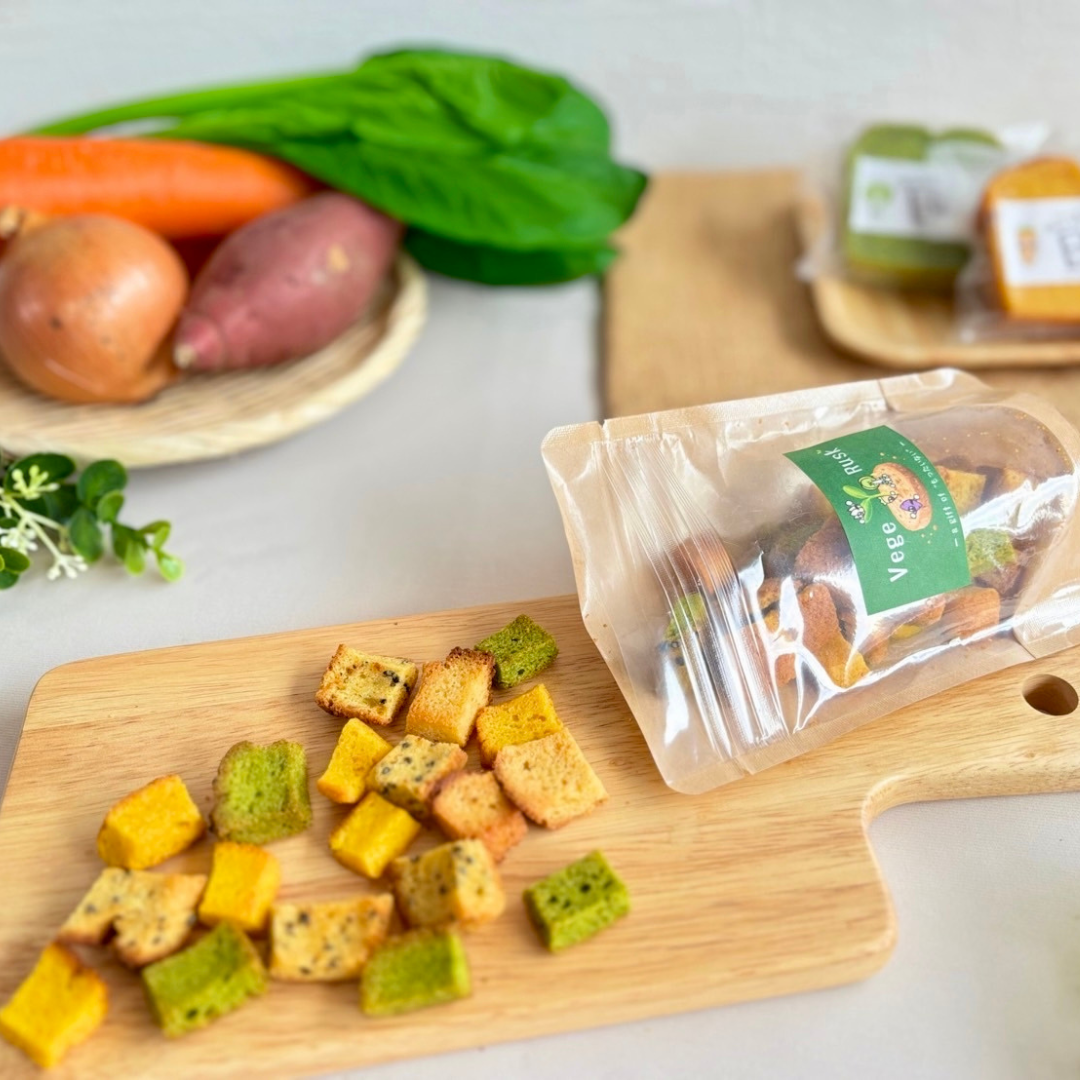 「Vege Rusk~a gift of "もったいない"~」は、北海道産の規格外野菜を使用したパウンドケーキの切れ端や在庫品を、さらにじっくり焼き上げて仕上げた、2回アップサイクルされたおやつです。